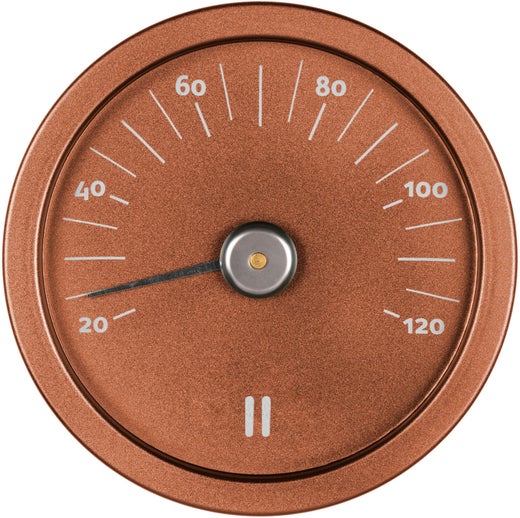 Ein Saunathermometer ist ein kleines, aber wichtiges Gerät, um ein angenehmes Saunaerlebnis zu gewährleisten. Das stilvolle Design des Saunathermometers ergänzt das Sortiment an kupferfarbenen Aluminiumprodukten. Die Temperatur wird in Celsius angezeigt.