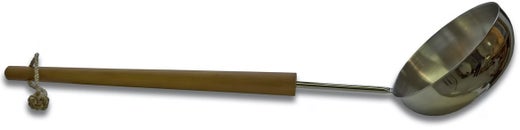Eine 65 cm lange Saunakelle aus Edelstahl, die bis zu einem Liter Wasser in ihrer Schöpfkelle fassen kann. Der Holzgriff besteht aus unbehandeltem Buchenholz.