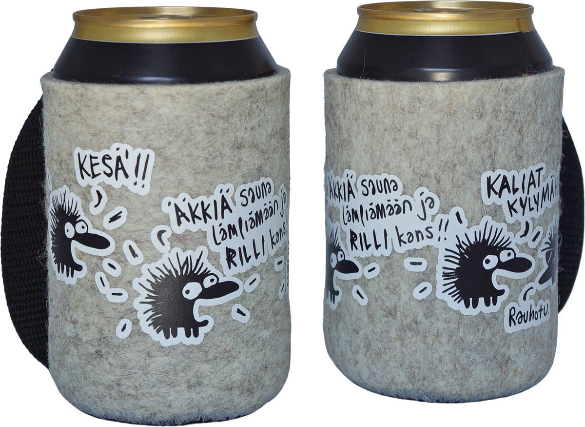 Die Kühler sind mit vier verschiedenen Texten auf Finnisch erhältlich: "RÖÖYH!!" (Buurrp!!), "MÄÄ RAKASHTAN SUA" (Ich liebe dich), "ÄLÄ SHÄÄ SHAATTNAA RUPEE MULLE!" (Leg dich bloß nicht mit mir an!) und "KESÄ!! Äkkiä sauna lämpiämään ja rilli kans! Kaljat kylymähän!" (Sommer, heizt die Sauna an und werft den Grill an, kühlt die Biere!).